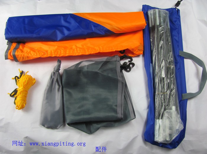 內部包裝明細:遮陽布、置物網、支撐桿(兩長兩短)、地釘及掛鉤、防風繩