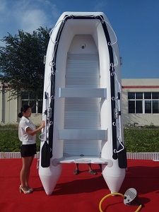 記得以前有個客戶被別的商家忽悠,一條幾百塊的充氣船價格也說可以站立,買回去后別說站立,坐在里面都搖晃的很厲害,相信很多人第一次買都遇過這種事,主要是這種充氣船價格便宜,誘惑力大。聽過很多用戶說怕船不穩(wěn)定,我們老總就開始重視這個問題,他自己帶了一條船開進(jìn)湖中,帶的是平底船,剛坐上去就搖晃的很厲害,試過很多次都無法站立。回去后找了很多資料來研究如何能使充氣船可以站立,經(jīng)過多次實(shí)驗(yàn)驗(yàn)證,把平底船做成V型底,在船底加固一根充氣龍骨,使充氣船底部成V型,這樣就可以將船上的重力集中到V型底重心部位,這樣即減小了水對船的阻力,也增加了整個船體的穩(wěn)定性,使船體不易搖晃側(cè)翻。內(nèi)部使用鋁合金板為船的地板,承受能力加強(qiáng)人不易踩空,人現(xiàn)在上面如履平地。